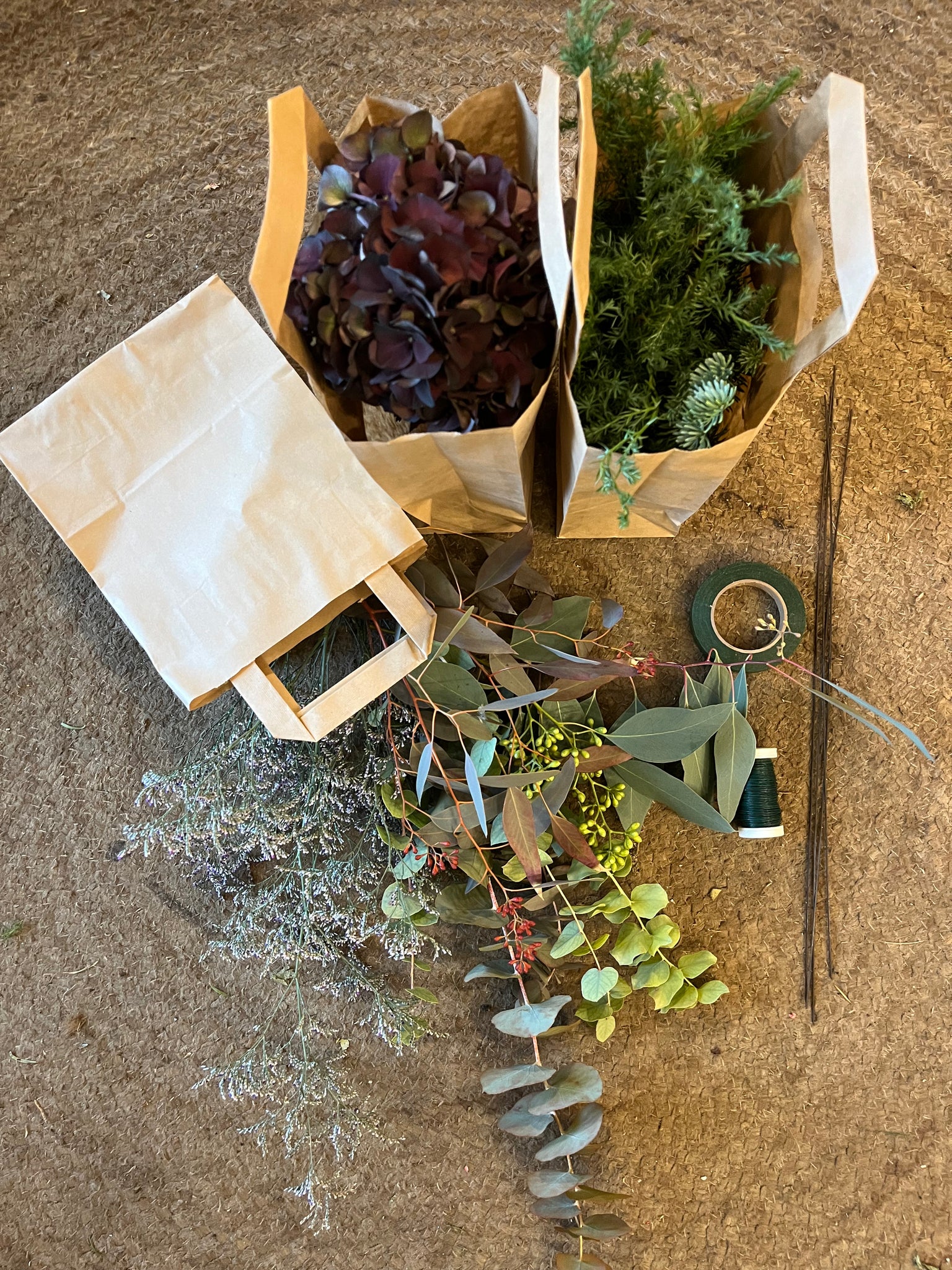 Du skal selv lave din ring af ståltråd og derefter klippe materialer op i mindre stykker som du binder rundt on kransen i små buketter. Du får både tråd og blomstertape med i kassen.