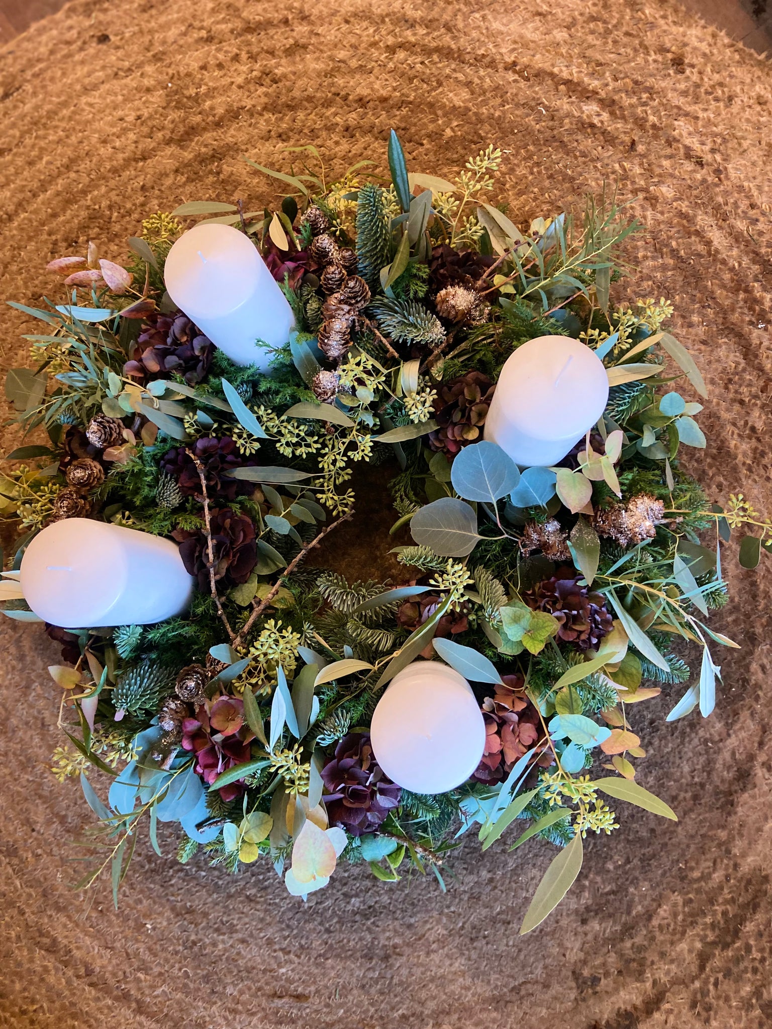 Kransen er inklusiv 4 hvide blok med brændetid ca. 15 timer.