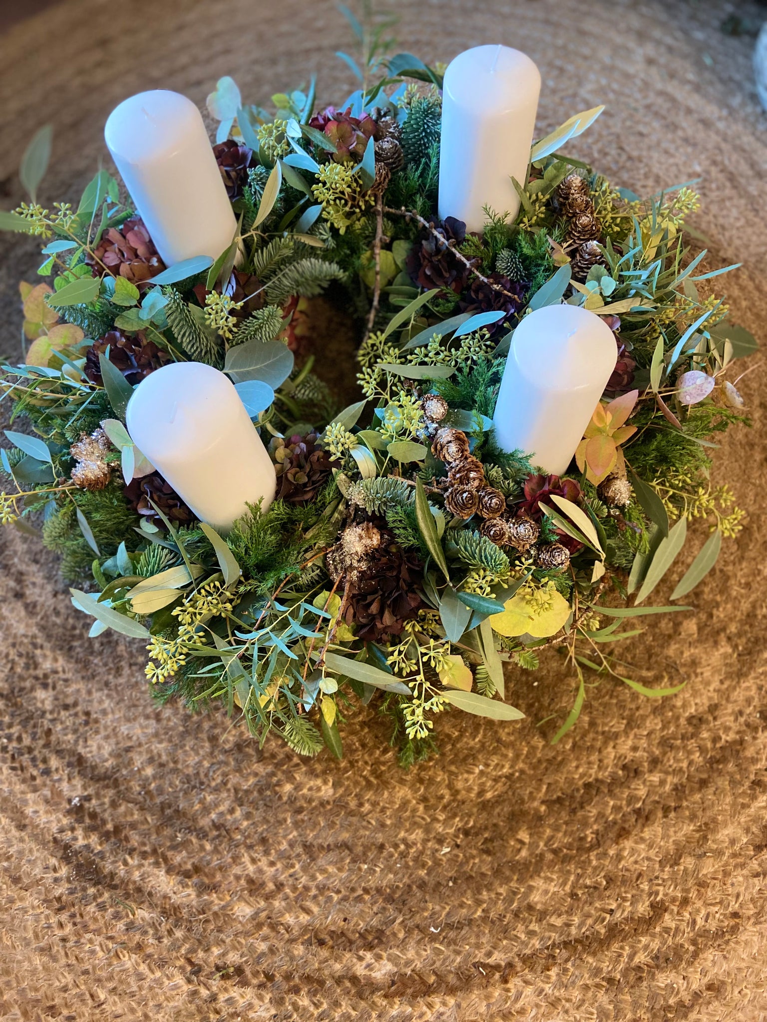 Adventskrans i oasiskrans, ca. 50cm i dia. Som holder blomsterne friske i lang tid. Forskelligt grønt som ikke drysser, og med flotte husløg. Adventskransen er beregnet til bloklys. Den skal stilles på et fad/stor tallerken, og kan nemt vandes ugeligt for at holde blomsterne friske.