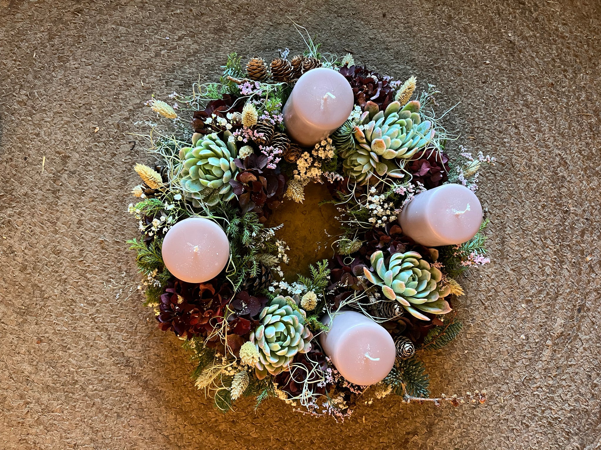 Adventskrans i oasiskrans, ca. 40cmi dia. Som holder blomsterne friske i lang tid. Forskelligt grønt som ikke drysser, og med flotte husløg. Adventskransen er beregnet til bloklys. Den skal stilles på et fad/stor tallerken, og kan nemt vandes ugeligt for at holde blomsterne friske.