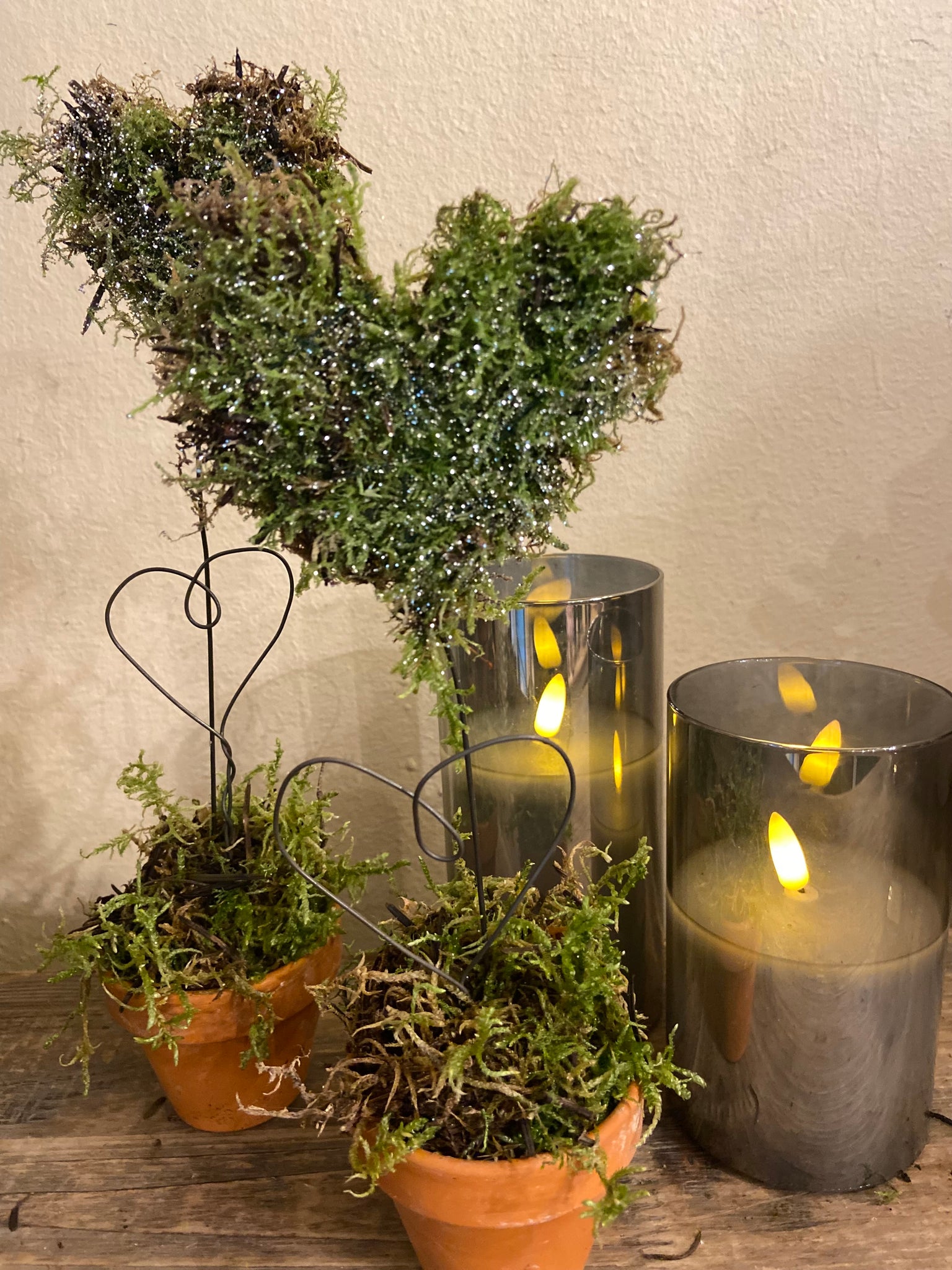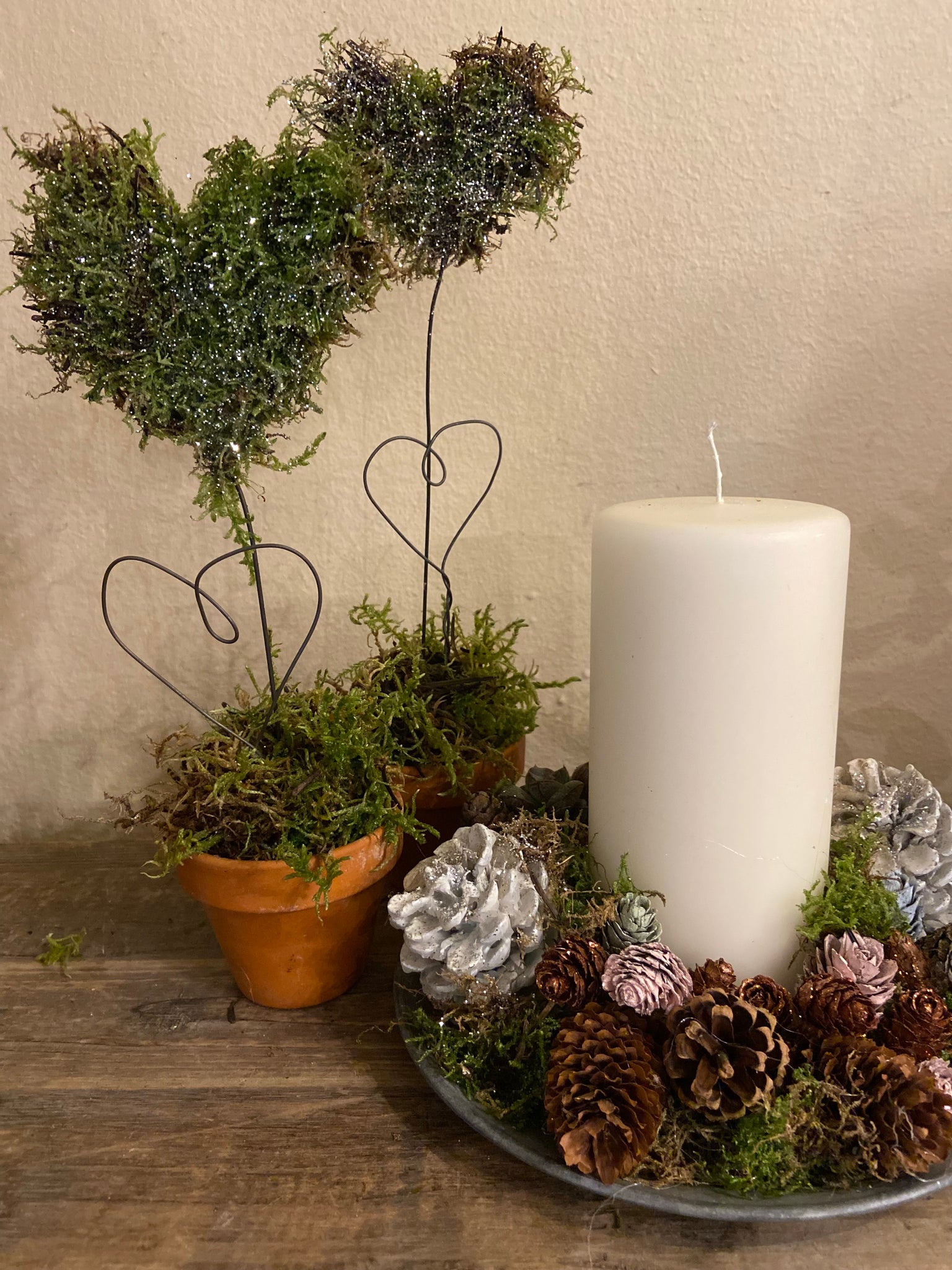 Med denne DIY kasse får du fem lerpotter som du pynter med moshjerter som du selv former af en metalpind og fylder med mos. Der er kogler og glimmer med til at pynte punden af potten.