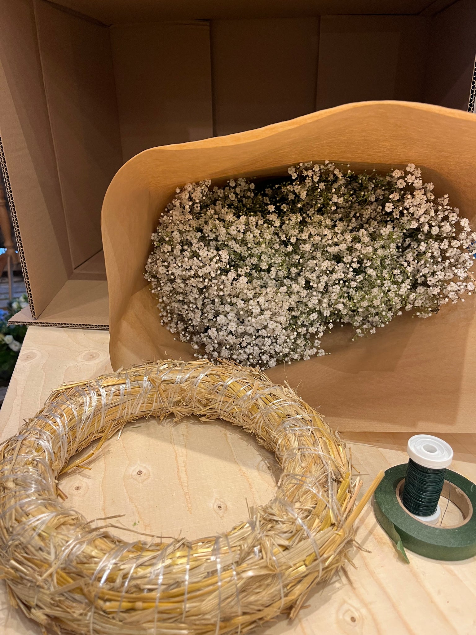 Du skal selv klippe materialer op i mindre stykker som du binder rundt on kransen i små buketter. Du får både tråd med i kassen.