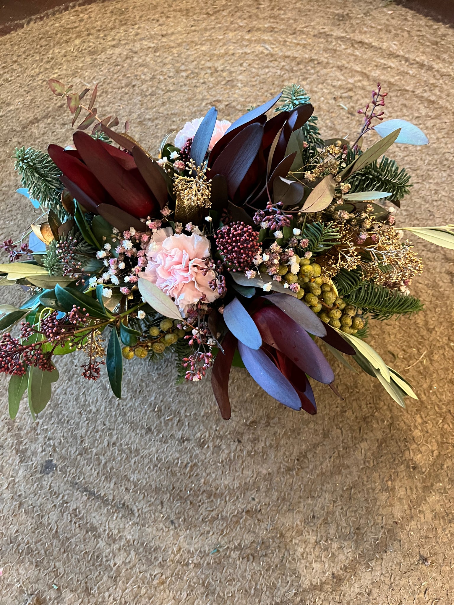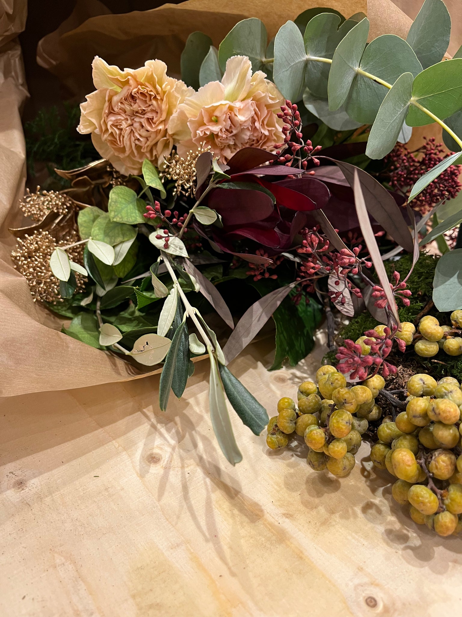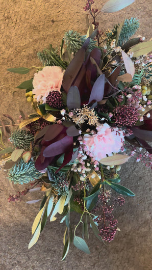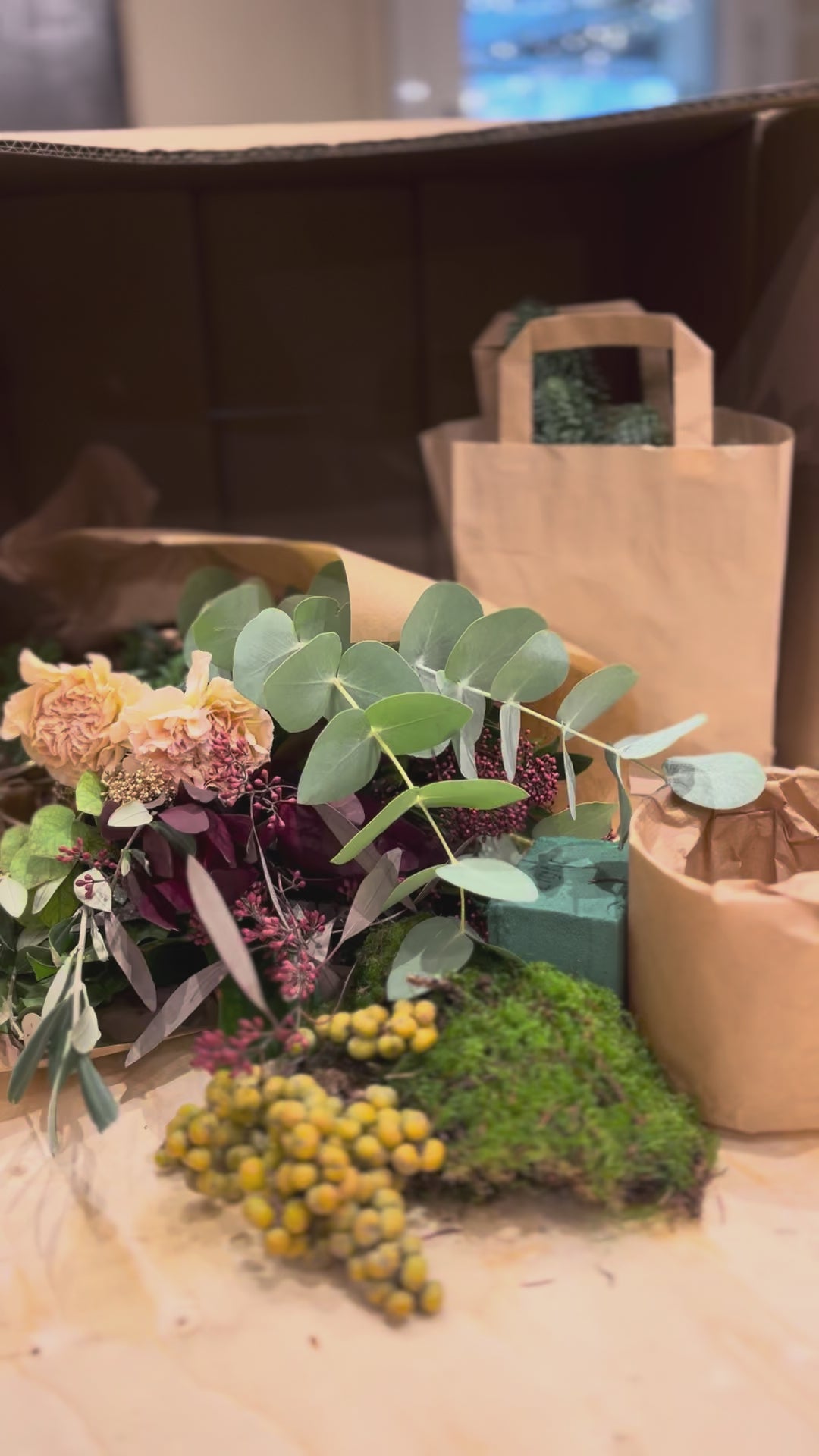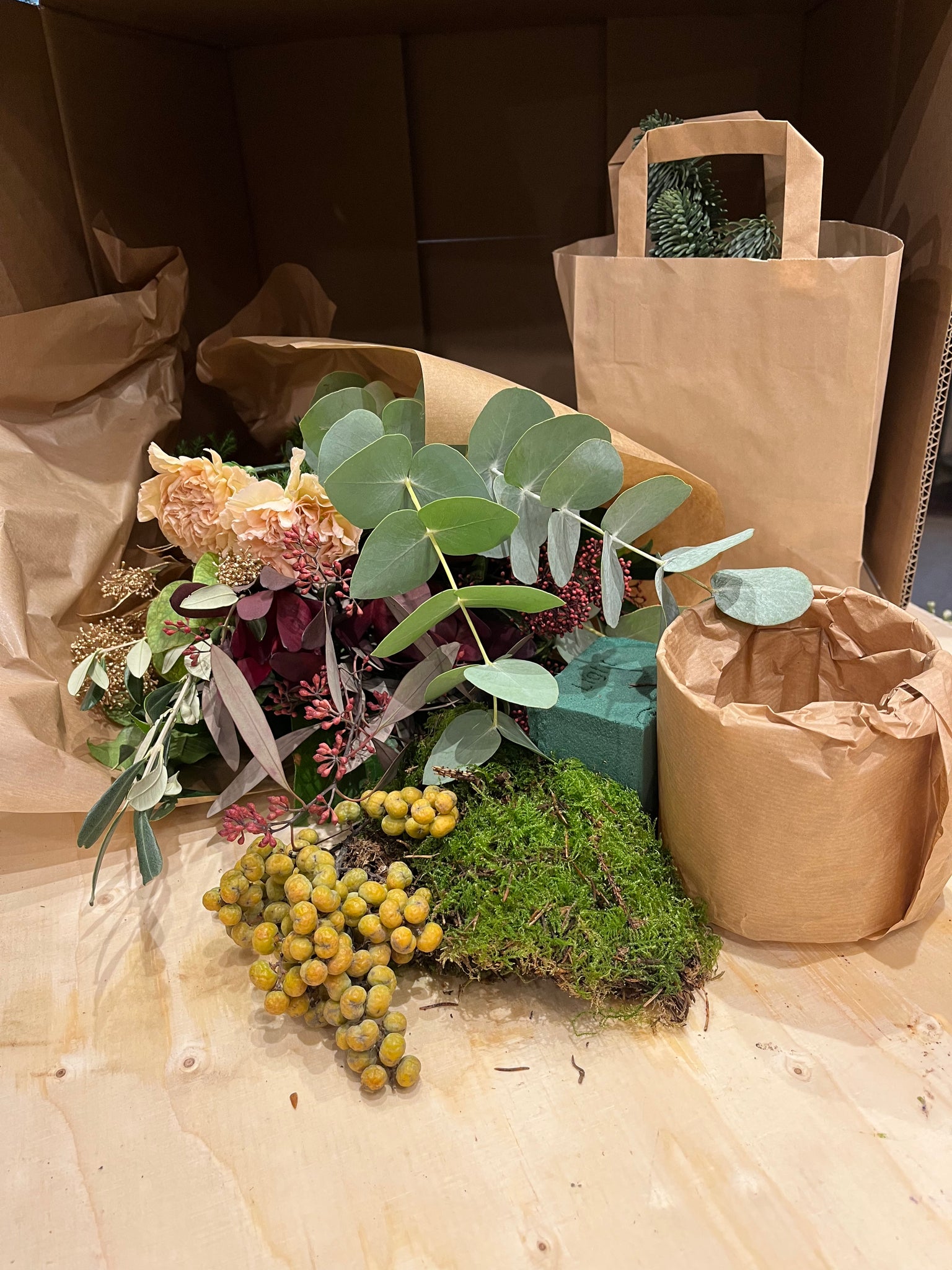 Du får en masse dejlige grønne materialer og blomster leveret i en kasse sammen med en glasvase og oasis.