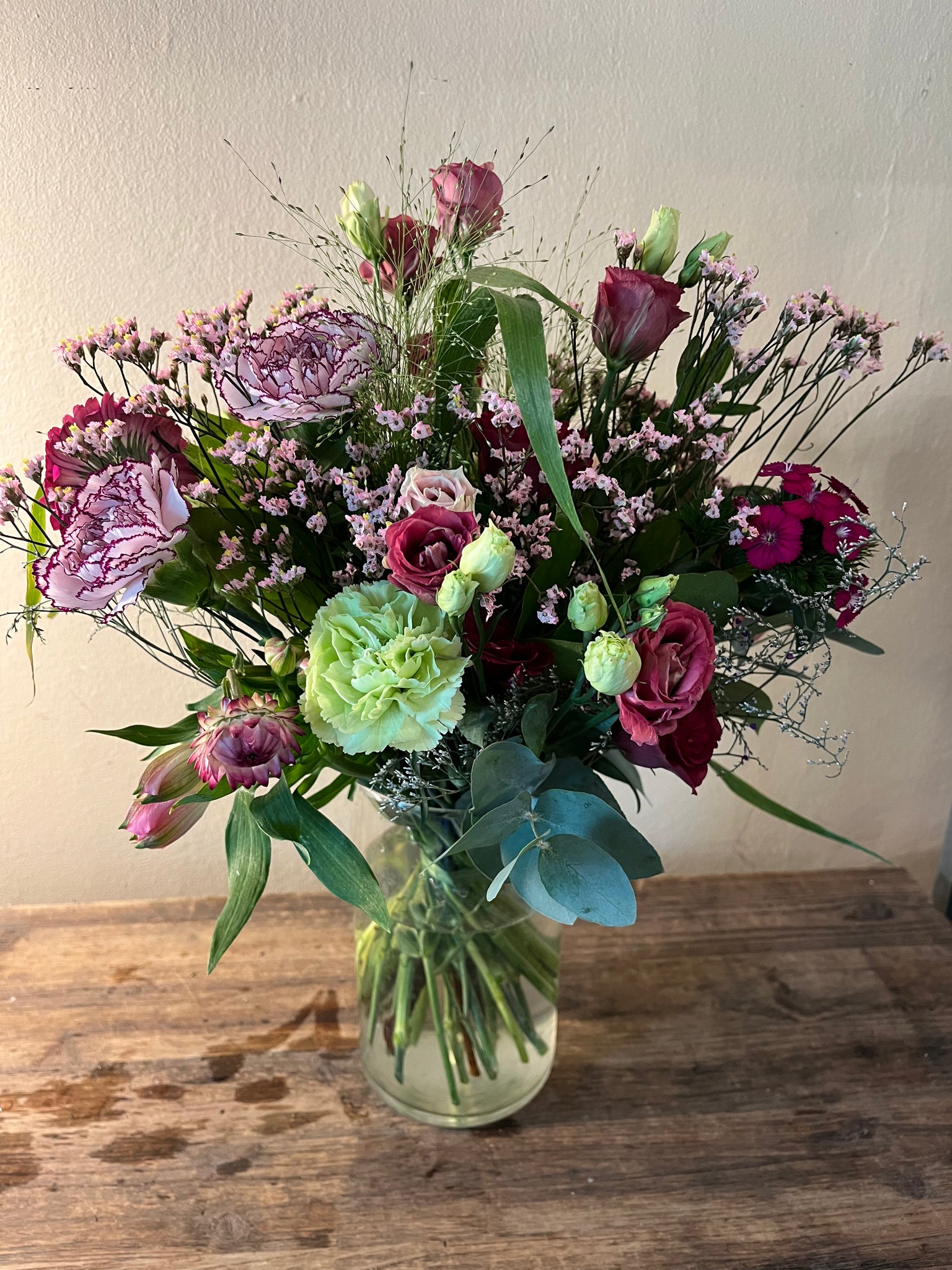 Blomsterbuket af friske blomster, smuk bundet i pink og rosa nuancer med grønt.